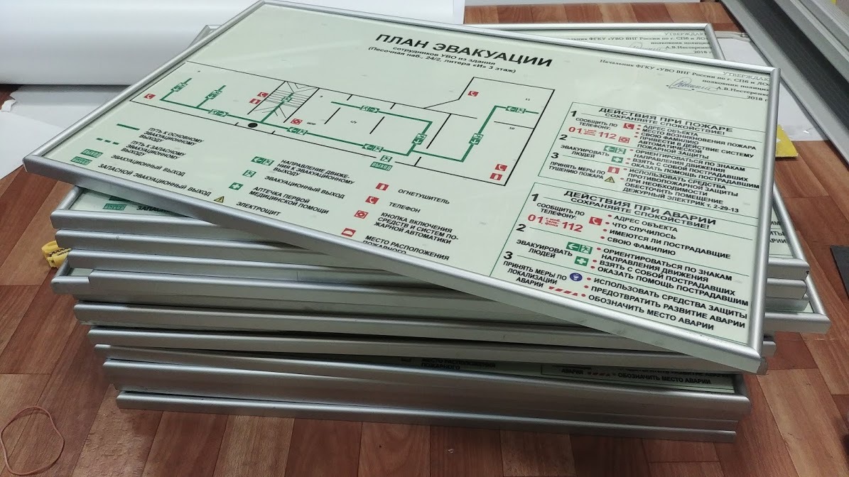 Бумажный или пластиковый лист со схемой закрепляется при помощи шурупов или наклеивается на стену. Возможно оформление в рамку. Процесс создания планов эвакуации требует соблюдения ГОСТов, так как специалист должен учесть время эвакуации, планировку и архитектурные особенности здания в целях обеспечения безопасности людей. При несоблюдении установленного регламента представители пожарного надзора могут признать документ недействительным в связи с его неспособностью выполнять необходимые функции